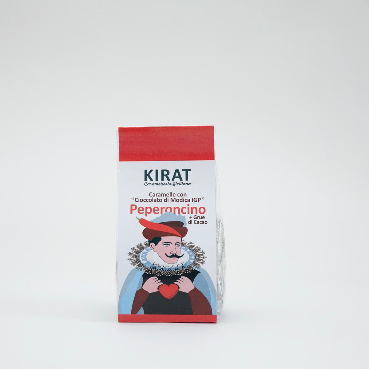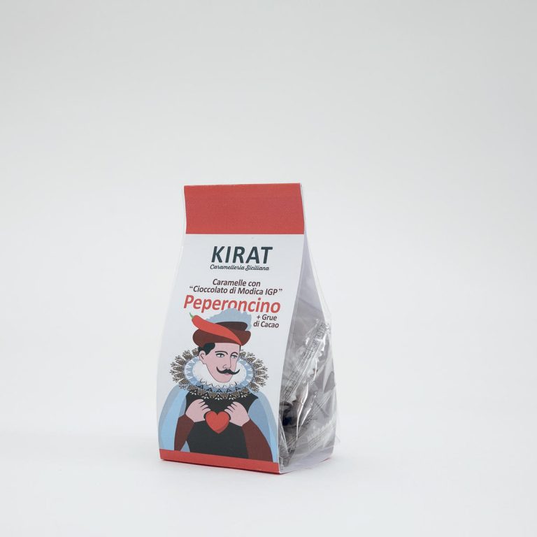 Caramelle artigianali al cioccolato di Modica IGP con Grue di Cacao gusto peperoncino. L’aggiunta del Grue di Cacao, che rappresenta la parte più pregiata e tenera delle fave di cacao, rendono questa caramella molto pregiata perché ha in sé tante proprietà benefiche come: antiossidanti e sali minerali, vitamine e grassi buoni. Il peperoncino regala alle caramelle un sapore unico, con delle note piccanti al punto giusto e allo stesso tempo ha un gusto intenso.