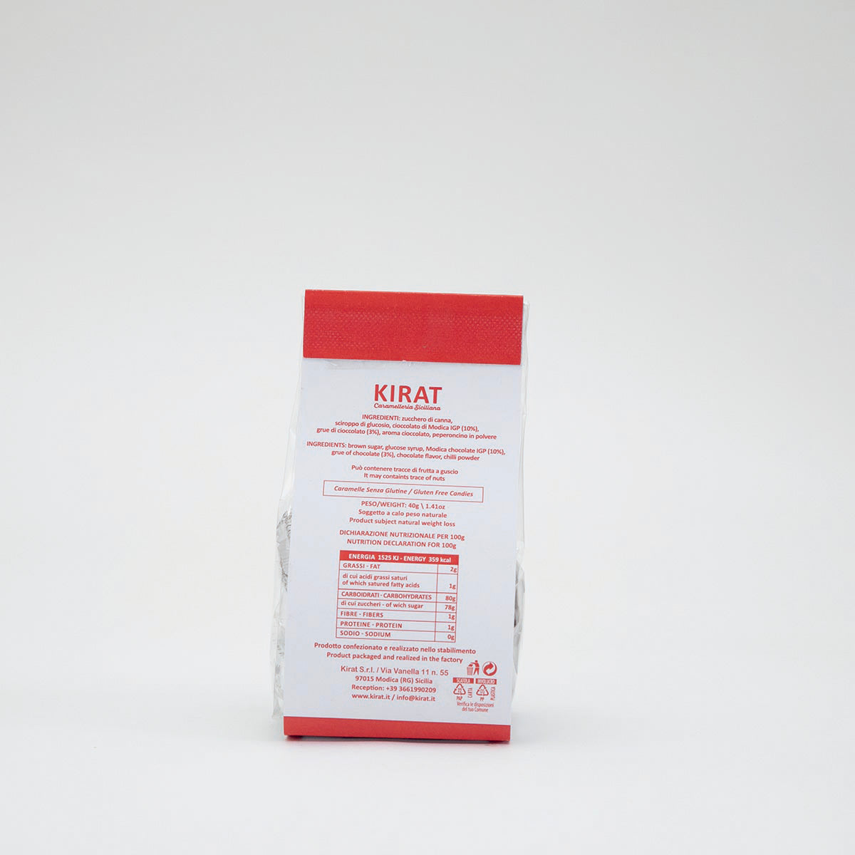 | INGREDIENTI: zucchero di canna, sciroppo di glucosio, cioccolato di modica IGP (10%), grue di cioccolato (3%), aroma cioccolato, peperoncino in polvere |