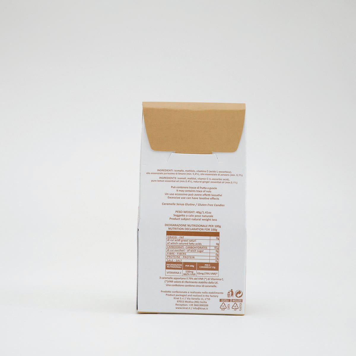 | INGREDIENTI: isomalto, maltitolo, vitamina-C (acido L-ascorbico) aroma naturale limone, aroma naturale zenzero |